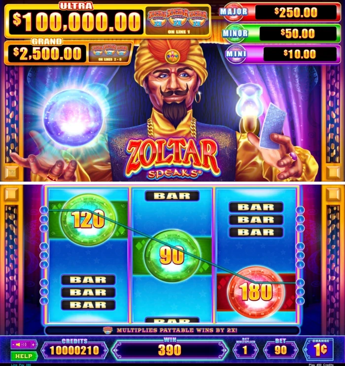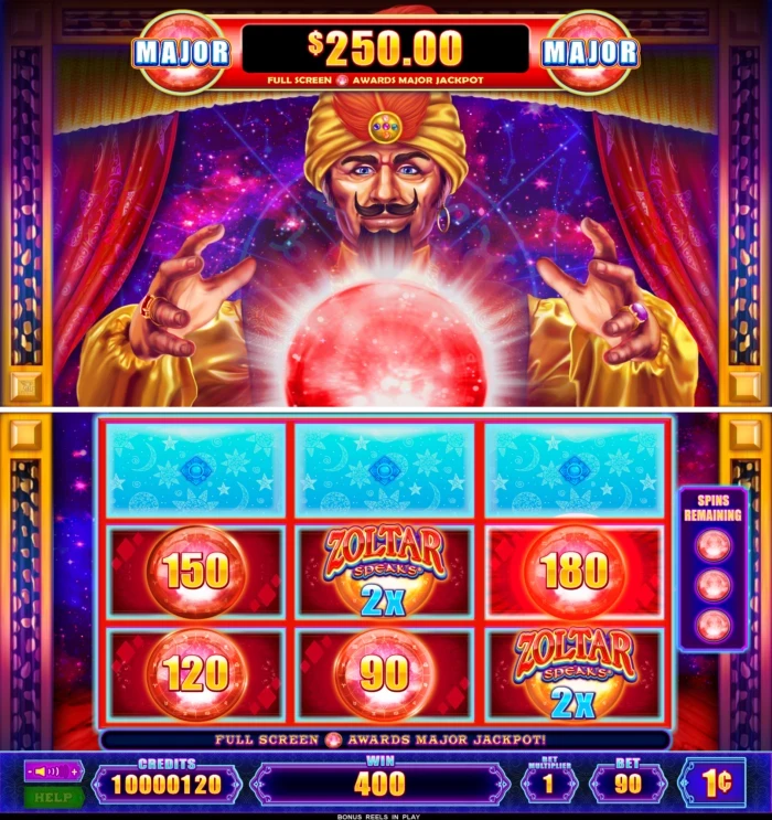 "The all-seeing, all-knowing great gypsy king Zoltar delivers a classic three-reel mechanical base game experience mixed with player-favorite video hold-and-respin bonuses. Theme showcases three distinct hold-and-respin bonuses, each with a unique twist, and all lead to bigger wins for players. Wild multipliers can apply to final prize and filling all 9 spots during hold-and-respin lands players a jackpot! Land three orbs, one of which has a jackpot, on winning line to win jackpot in base game!"
